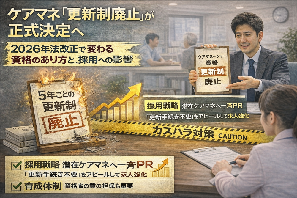 14件中 1~10件目を表示中 トイレが「健康診断」の場に。排泄解析AIが変える、2026年の施設運営と事務負担の極小化 介護現場において、精神的にも肉体的にも負担が大きい「排泄介助と記録」。 この領域に、今、革命が起きています。 2026年、大手設備メーカーやベンチャー企業が相次いで実用化しているのが、AI搭載の「排泄… CARELAY運営 定員1人最大2.4万円の補助。「サービス継続支援事業」を活かした物価高・災害対策 2026年1月14日、厚生労働省より「介護保険最新情報vol.1461」が発出されました。 物価高騰が続く中、介護サービスの安定的な継続を支援するため、「介護事業所等サービス継続支援事業」の実施要綱が… CARELAY運営 【1/16速報】居宅介護支援に「処遇改善加算」新設!加算率2.1%獲得のための“2つの選択肢” 本日2026年1月16日、厚生労働省の審議会にて、6月施行の臨時報酬改定の全容が明らかになりました。 経営者にとって最大のニュースは、居宅介護支援および介護予防支援への「介護職員等処遇改善加算」の新設… CARELAY運営 【1/13最新通知】賃上げ加算の条件に「データ連携システム」が追加。アナログ経営が招く“数万円の損失” 2026年1月13日に発出された厚労省通知(vol.1460)は、経営者にとって極めて重要な警告となりました。 2026年6月の臨時改定で実施される「賃上げ」のうち、上乗せ分(月額5,000円〜7,0… CARELAY運営 【1/9最新通知】最大1,500万円補助!「省力化投資補助金」の対象に介護業が追加。清掃・配膳ロボ導入の好機 2026年1月9日、厚生労働省より「介護保険最新情報vol.1458」が発出されました。 注目すべきは、中小企業の生産性向上を支援する「中小企業省力化投資補助金」の対象に、正式に介護業が追加された点で… CARELAY運営 クリニック・訪問看護は「2段階」の備えを。史上初の診療報酬スケジュールと2026年経営戦略 医療・介護の連携が進む中、2026年度の診療報酬改定はかつてない変則的なスケジュールで進行しています。 特筆すべきは、医療経済史上初となる「2段階での本体引き上げ」の決定です。2026年6月: 診療報… CARELAY運営 2026年度「財務諸表の公表」が全事業所義務化へ。経営の透明性が“採用力”を左右する時代 2026年度より、すべての介護サービス事業所に対して「財務諸表(収支報告)の公表」が事実上義務化されます。 これまで一部の社会福祉法人などに限られていたルールが、営利法人を含む全事業所に拡大される形で… CARELAY運営 ケアマネ「更新制廃止」が正式決定へ。2026年法改正で変わる資格のあり方と、採用への影響 ケアマネジャーの深刻な不足を背景に、厚生労働省はついに大きな舵を切りました。 2025年末の介護保険部会での取りまとめを経て、ケアマネジャー資格の「5年ごとの更新制」を廃止する方針が固まりました。 2… CARELAY運営 2026年「カスハラ対策義務化」へのカウントダウン。現場を守るために経営者が今すぐ整備すべき「4つの柱」 2026年、すべての介護・福祉事業所にとって避けて通れない大きな法改正が行われます。 それは、「カスタマーハラスメント(カスハラ)対策の義務化」です。 労働施策総合推進法の改正により、利用者やその家族… CARELAY運営 障害福祉サービスも2026年6月に臨時改定へ。「新規事業所の報酬引き下げ」という異例措置の衝撃 介護報酬の臨時改定と並行し、障害福祉サービス等報酬についても2026年6月に「臨時改定」が実施されることが正式に決定しました。改定率はプラス1.84%。介護と同様、他産業に負けない「月額1万円程度」の… CARELAY運営 1 2 次へ 最後へ